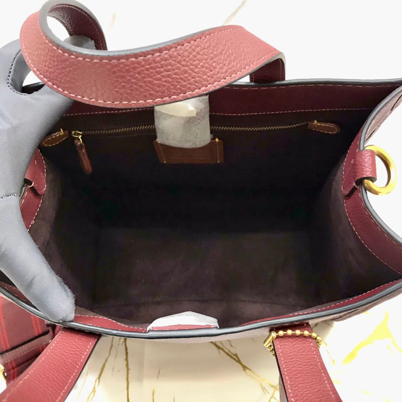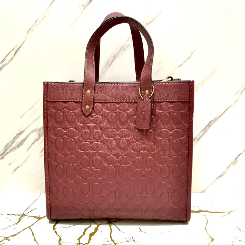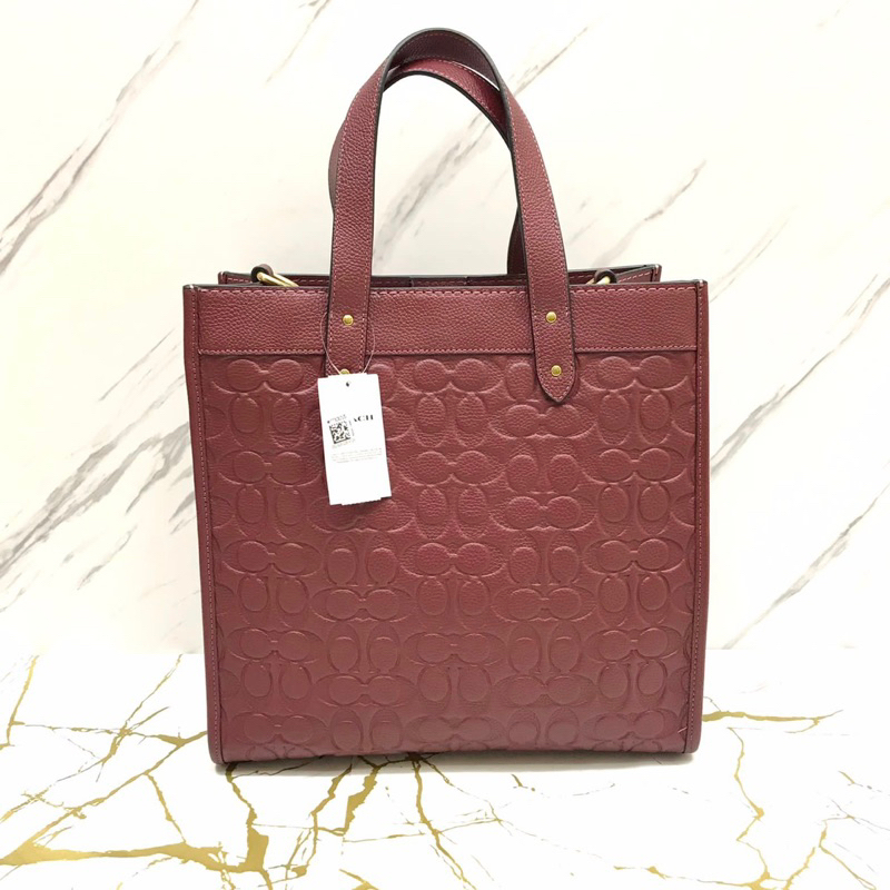 Coach Field Tote 30 – A sophisticated and versatile handbag that combines the timeless Coach signature pattern with an elegant wine embossed leather finish, offering both style and practicality.