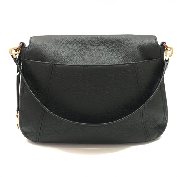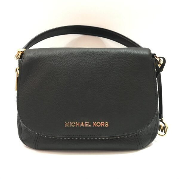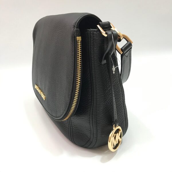 Exterior: A zippered compartment on the flap of the bag and a meta MK logo hanging on the side of the bag.