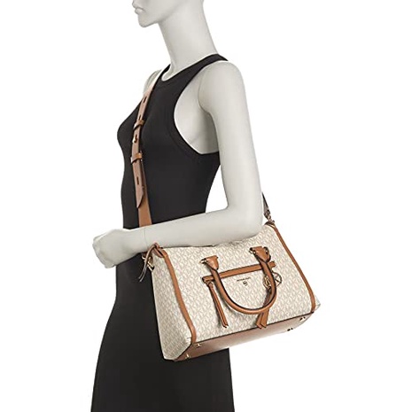The Michael Kors Carine Medium Satchel in Signature Vanilla/Acorn is an elegant and versatile handbag that combines timeless charm with practical functionality. Its sophisticated design and warm color palette make it a standout accessory for any occasion