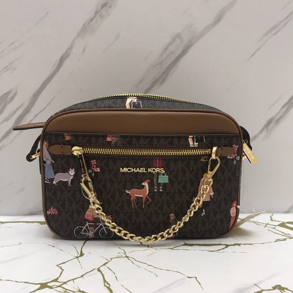 Michael Kors Jet Set Large Zip Chain Crossbody Signature Brown Multi Girls