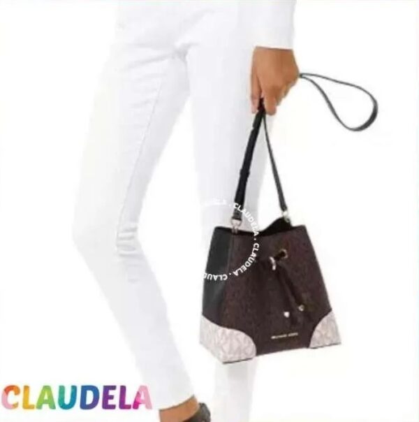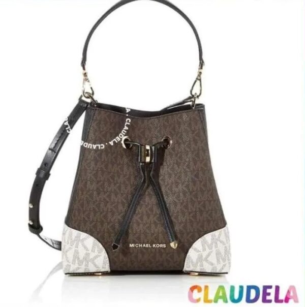 The Michael Kors Mercer Gallery Bucket Small in Colorblock Signature Brown Multi is a refined and compact bag, perfect for those who love classic style with a modern twist